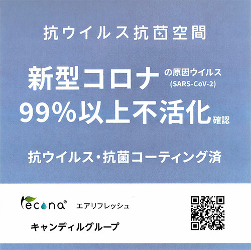 当店は光触媒コーティング「レコナ エアリフレッシュ」を施工し、 抗ウイルス抗菌加工をしていますので、店内は安心の空間です。 今後も引き続き感染症対策に取り組みながら、お客様とスタッフの健康と安全を第一に営業してまいります。お客様にはご不便をおかけいたしますが、何卒ご理解、ご協力のほどお願い申し上げます。 レコナ エアリフレッシュ >